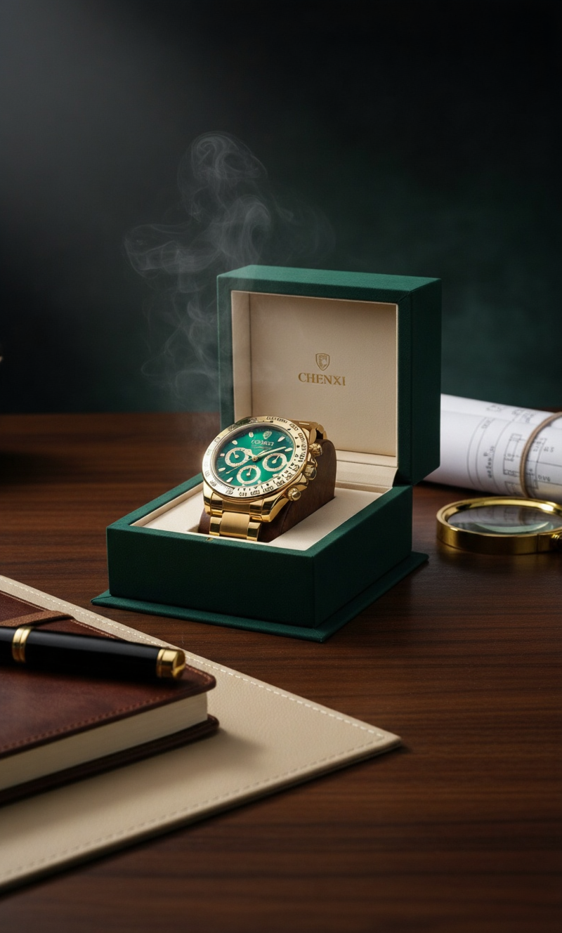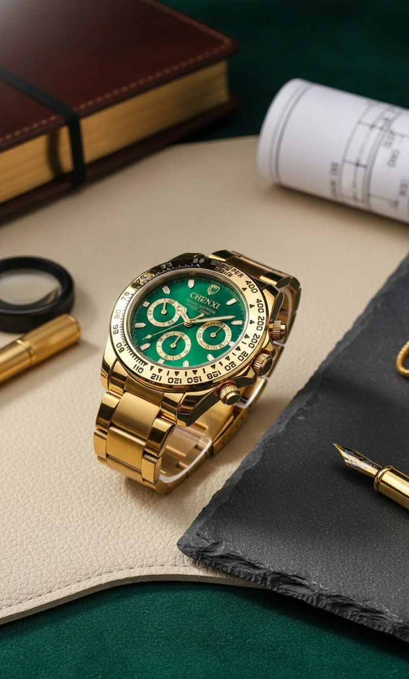 CHENXI Gold Chronograph Watch – Emerald Dial Luxury Men's Timepiece
