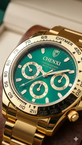 Turn heads with the CHENXI Gold Chronograph — a statement of power, precision, and prestige. Featuring a radiant emerald dial framed by a gold-tone tachymeter bezel, this watch blends classic luxury with modern edge.