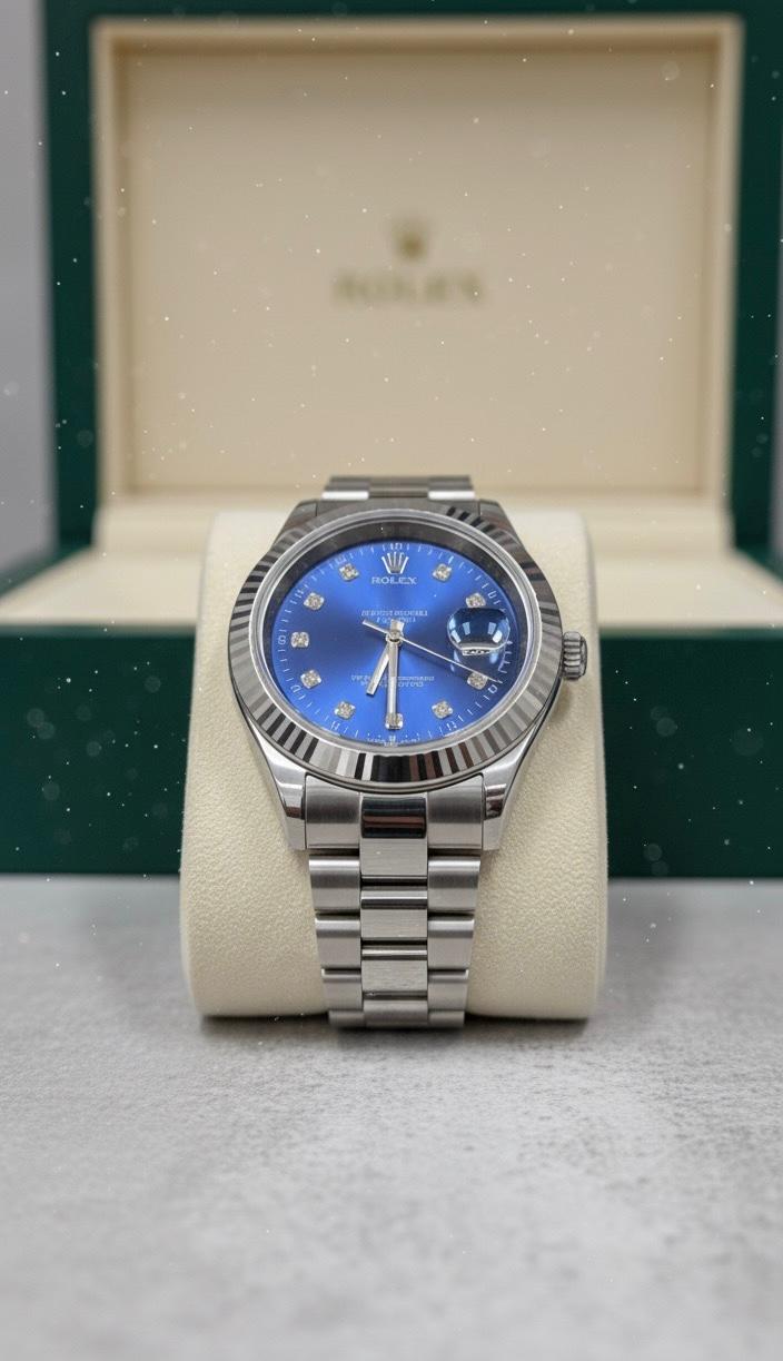 • 💠 Striking Blue Dial – Enhanced with 10 brilliant-cut diamond hour markers set in white gold.